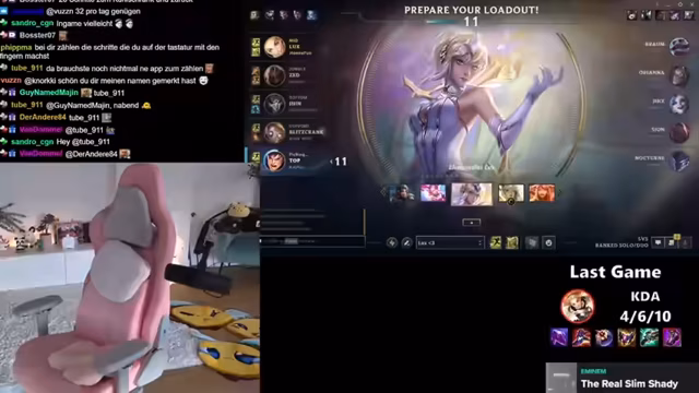 06:26:16Der Streamer plant für Mitte April eine Reise nach Korea, um direkt in die Solo Queue einzusteigen und seinen dortigen Rank zu ermitteln. Er identifiziert sich selbst als einen aggressiven Spieler, der oft vorne im Kampf steht. Sein Champion Lux lebt stark von der Early-Lane-Phase, aber ihr Scaling hinten im Spiel ist problematisch, da sie nicht sidelanen kann.