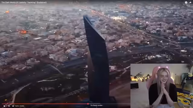 01:00:14Nach dem intensiven Thema 'Yachting' kommen andere Vorschläge aus dem Chat auf. Geplant ist ein weiteres Video über 'The rise of sponsored trips to Dubai' und 'The dark side of fame' mit Justin Bieber. Die Streamerin unterbricht kurz, um auf die Toilette zu gehen. Anschließend wechselt sie das Thema und berichtet von extremen Wetterbedingungen an ihrem aktuellen Wohnort. Sie schildert, dass es seit zwei Wochen sehr stürmisch ist, so stark, dass sie sich mit 57 Kilo beinahe weggeschoben gefühlt hat, und sie sich Sorgen macht, ob bald der Flug zu ihrem Vater überhaupt möglich sein wird.