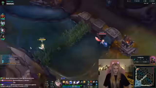 04:32:53Die Streamerin analysiert das aktuelle Spiel und identifiziert die Kayle auf der Toplane als Hauptproblem, da diese stark im Federn ist und nicht genug Farm sammelt. Sie äußert ihre Angst vor gegnerischen Champions wie dem unsichtbaren Twitch und konzentriert sich auf Visionserstellung durch Pink-Wards. Außerdem erwähnt sie, dass sie wegen schlechter Spielergebnisse und der eigenen Einstellung in Tilt geraten ist und dadurch unkooperativ im Gameplay wird.