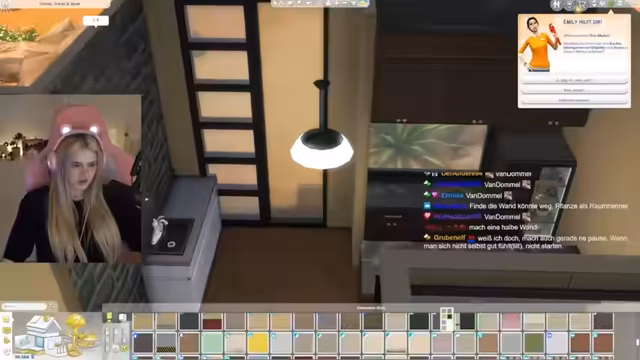 10:23:00Der Prozess des Hausbaus in Sims nähert sich dem Ende. Der Streamer feilt an den Details wie Fenstern, Böden und Einrichtungsgegenständen. Er zeigt verschiedene Möbeloptionen und nimmt Anregungen aus dem Chat an. Das Ziel ist es, ein modernes, aber gemütliches ('geil modernes') Haus zu schaffen, das einem coolen Vibe entspricht und persönlichen Vorstellungen entspricht. Die Migräne des Streamers schreitet dabei fort, was ihn aber nicht am Bau hindert.