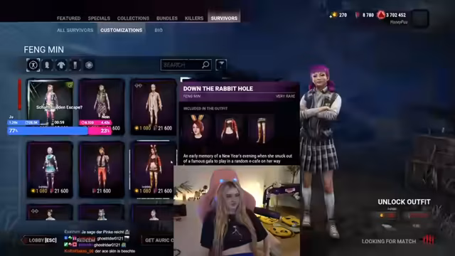 11:59:03Die Streamerin zeigt, wie sie ihre Outfits in Dead by Daylight anpasst, und ändert ihr eigenes Kleidungsstück, um anonym zu bleiben. Der Chat gibt Empfehlungen für Skins, und sie überlegt, welche Outfits sie bevorzugt. Dabei werden auch andere Spiele wie League of Legends erwähnt, und es wird über die Bedeutung von indivuellen Skins und deren visuellen Effekten diskutiert.