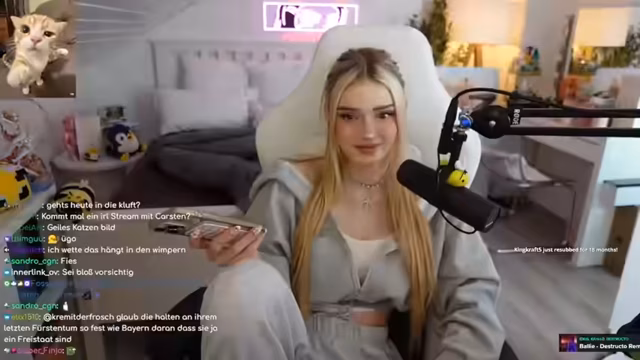 00:00:10Der Stream beginnt mit lockeren Begrüßungen und einer lockeren Atmosphäre. Es wird über die kurze Schlafzeit gesprochen, wobei der Streamer nach nur vier bis fünf Stunden wegen Pinkelbedürfnisses aufgewacht ist. Katze Koko ist anwesend und wird zum Fotografieren aufgefordert, während auch persönliche Gewohnheiten, wie der monatliche Besuch beim Friseur mit den Eltern, erwähnt werden.