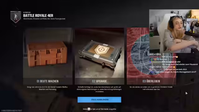 01:29:42Während des Spiels unterhält sich die Streamerin über ihr Privatleben und ihre Gewohnheiten. Sie äußert sich über ihre morgendliche Routine und stellt fest, dass sie ihr Bett nicht macht, da sie es als unnötig empfindet. Stattdessen klopft sie nur ihre Kissen aus. Diese Alltagsbetrachtungen wechseln sich mit den intensiven Emotionen des Spiels ab, wie Erleichterung, als sie einen Gegner eliminiert, und Frustration über das Spielgeschehen und die eigene Performance.