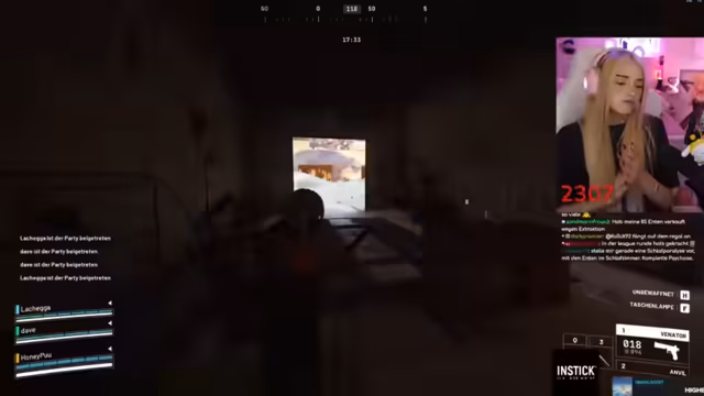 02:57:01Die Streamerin gerät in eine gefährliche Situation, in der sie von zwei Teams umzingelt ist. Sie beschreibt, wie sie einen Gegner ausschaltet und sich in ein Gebäude zurückzieht, während sie auf Verstärkung wartet. Es kommt zu einem turbulenten Kampf, bei dem sie mehrere Gegner neutralisiert und sich schließlich in Sicherheit bringen kann.