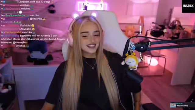 01:48:27Die Streamerin präsentiert ihr privates Stream-Setup, das sich in ihrem ehemaligen Kinderzimmer befindet. Sie zeigt eine Lavalampe, die sie als nostalgisch beschreibt, und Würfel aus Las Vegas. Sie erklärt, warum sie dieses Zimmer genutzt hat, da es mehr Abstand zu den Elternzimmer bot. Das Setup wirkt geordnet und persönlich und dient als Rückzugsort und Arbeitsbereich.