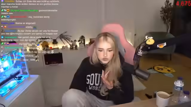 03:20:22Die Streamerin zeigt ihre babyrosa glitzernden Nägel und erwähnt, dass sie einen Bienenteppich geschenkt bekommen hat, den sie etwas nach hinten schieben möchte. Sie spricht darüber, dass auch Micky Hass abbekommt, was ihn aber nicht kümmert, und dass es einfacher ist, so etwas zu verkraften, wenn man einen Partner hat, der einem zur Seite steht. Sie erwähnt einen Mini-Basketballkorb und dass sie den dazugehörigen Ball gefunden hat, ihn aber noch aufpumpen muss, da keine Pumpe mitgeliefert wurde. Sie erinnert sich an alte Zeiten und erwähnt, dass sie noch einen Kaffee machen muss. Es ist bereits halb eins und sie hat einem Kumpel versprochen, nur bis zwölf zu streamen. Sie entschuldigt sich bei Philipp, den sie später anrufen will, und kündigt an, dass sie noch ein Leak in League of Legends spielen wird, abhängig vom Ausgang des ersten Spiels. Sie wollte eigentlich in Korea eine Tierlampe kaufen, fand diese aber zu klein und teuer.