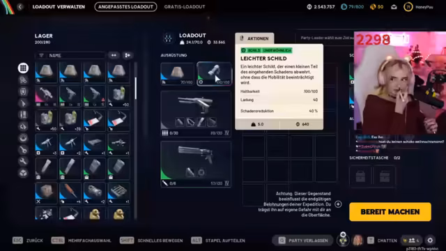 01:35:49Für die neue Runde wird ein Plan geschmiedet, den Gegnern den Loot wegzunehmen, da viele Spieler mit Gratis-Gear antreten. Der Streamer entscheidet sich für ein voll beladenes Loadout mit einem mittleren Schild und mehreren Slots. Es werden verschiedene Waffen und Granaten diskutiert, wobei man sich letztlich für Kältewelle als Zielort und bestimmte Ausrüstungsgegenstände wie Shockwellenminen und Granaten entscheidet.