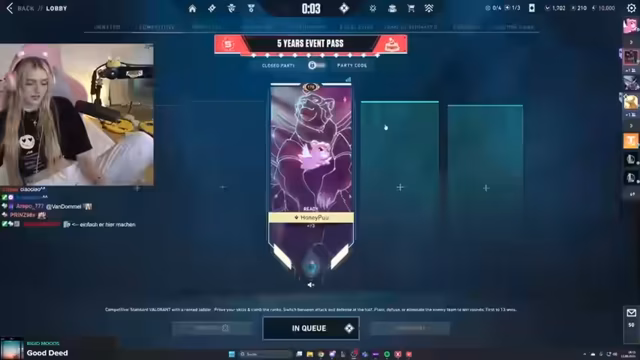 00:01:38Nachdem sie ihre Zuschauer begrüßt hat, erläutert sie ihre Pläne für den heutigen Stream und die Spiele, die spielen möchte. Danach geht sie auf eine persönliche Frage im Chat ein, wie man einen Crush ansprechen kann, und teilt eigene Erfahrungen mit. Sie berichtet, dass sie wegen ein paar Liegestützen extremen Muskelkater hat.