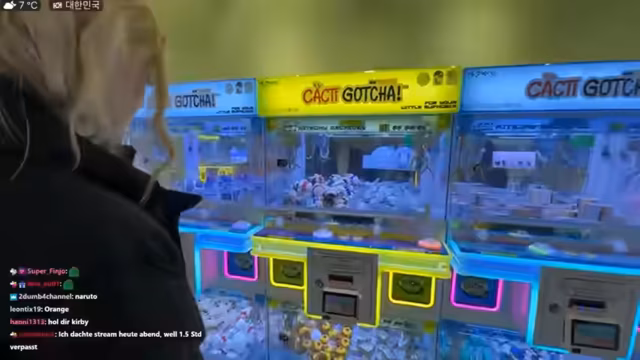 02:23:06Die Gruppe versuchte, mit einem Kran eine Pikachu-Figur aus einem Automaten zu greifen. Dies gestaltete sich jedoch als sehr schwierig und erforderte viele Versuche, teilweise mit Isa als Bedienerin. Der Streamer kommentierte das Geschehen mit Emotionen wie Frustration, Aufregung und Euphorie. Die Figur wurde erst nach vielen Anläufen gewonnen, wofür der Streamer viel Geld ausgegeben hatte. Danach beschlossen sie, die Pokémon-Figur aufzubewahren und gingen weiter.