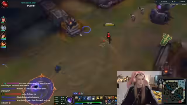 07:56:32Die Spielerin kommentiert, dass der Gegner nervt und dass sie Drake machen muss. Sie bedauert, dass sie nicht rechtzeitig gekommen ist. Sie erklärt, dass ihr der Pinkport sehr wichtig war. Sie freut sich über einen gelungenen Spielzug, kritisiert aber Garen als "Braindead-Champ" und gibt zu, sauer zu sein. Sie fragt, ob andere auch immer ihre Erdbeeren oder Himbeeren inspizieren. Sie will keine Extra-Proteine in Form von Insekten und mag Anivia im Team. Sie kritisiert Victor dafür, dass er auf jeder Lane pusht und bedauert, dass ihre Mitspielerin keine Ult eingesetzt hat. Sie kann niemanden one-shotten, außer Fleisch Jinx. Sie vermutet, dass die Gegner einen Ward hatten und dass sie deshalb zur Basis gegangen ist. Sie bemerkt, dass zwei Lanes nicht pushen und dass sie vom Bot auf Top hin und her gescheucht wird. Sie bezeichnet einen Gegner als "dreckigen Dreckschamp" und bedauert, dass sie ihren Flash verschwendet hat. Sie liebt Himbeeren und kommentiert, dass ihre Ultrakens eine Sekunde Cooldown hat. Sie bittet um Schutz und kommentiert, dass ein Gegner sauer ist und ins Leere zielt. Sie hat kein Mana mehr und sieht einen Garen auf sich zuspinnen. Sie hätte Lulu damit töten können und fragt, was "passable" in League of Legends bedeutet. Sie erklärt, dass sie in ihre Himbeere geschaut hat und dass sie schon lange die Ja gewesen ist. Sie befürchtet, dass ein Garen von der Seite angeflasht kommt und freut sich über einen gelungenen Spielzug auf die Caitlyn.