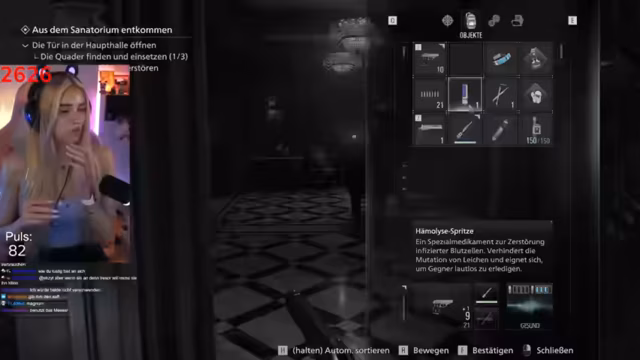 03:21:04Die Streamerin erkundet das Sanatorium und sucht nach Loot, dabei äußert sie sich frustriert über leere Schubladen und wiederkehrende Gegner. Sie beschwert sich, dass sie immer die gleichen Orte aufsuchen muss und findet kaum Ressourcen wie Metall. Die Angst vor Gegnern und das Gefühl, wichtige Gegenstände zu übersehen, bestimmen ihre Bewegungen. Sie äußert auch ihre Angst vor Schleichphasen und stellt ihre Spielfrage, ob es sich mehr um ein Action- oder Survival-Spiel handelt.