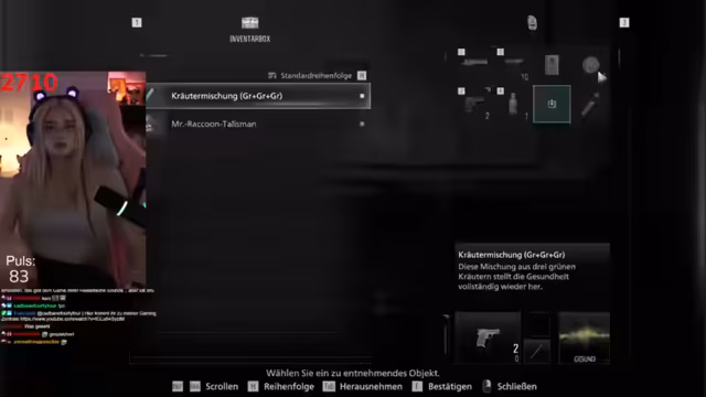 02:51:06Ein Chat Hinweis führt zu einem Easter Egg bezüglich des Datums 29.07.2015, als Capcom die Marke für einen Spin-Off-Titel registrierte. Im Spiel selbst gerät die Streamerin in eine spannungsgeladene Situation, da sie den Gegner Isaac hört, aber nicht auf der Karte sieht. Sie äußert ihren Schiss und plant einen riskanten Manöver, um ihm auszuweichen, wobei sie ihre beschränkte Munition im Kopf behält.