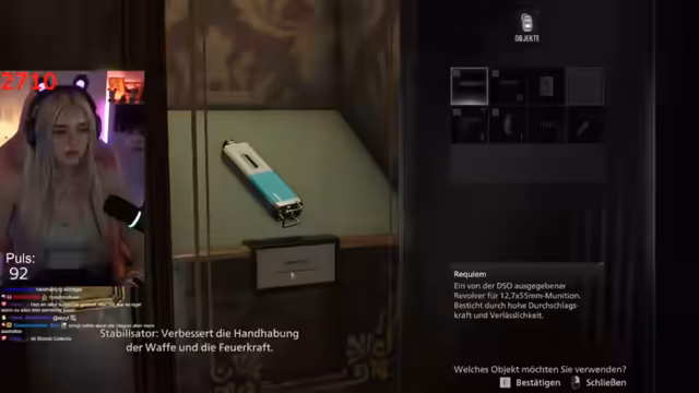 00:13:58Nach dem Neustart des Spiels setzt der Streamer seine Erkundung fort. Er trifft auf Helena, die er versehentlich anstatt eines Zombies anvisiert. Er beschließt, nicht zu schießen und stattdessen zu schleichen. Im Verlauf findet er wichtige Items wie ein Blutentnahmegerät und entscheidet sich, sein Inventar zu erweitern, indem er für eine Stabilisator-Vorrichtung acht Münzen ausgibt. Dies spiegelt seine strategische Entscheidung wider, mehr Gesundheit zu priorisieren, anstatt Feuerkraft.