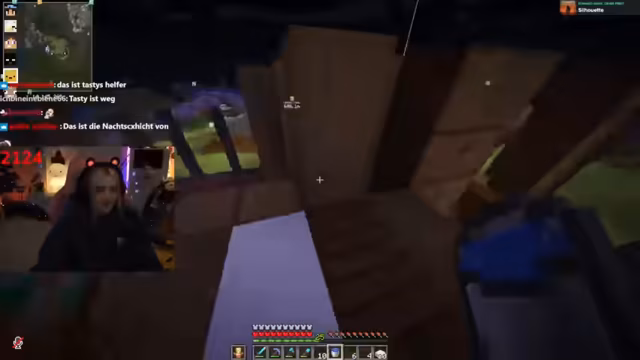 03:07:33Für die Nacht wird eine Nachtwache mit Kato organisiert, der Minecraft-Experte ist und den PC fernsteuert. Das Ziel ist der Aufbau eines Kaiserreichs mit riesigen Bücherregalwänden und einem Holzboden. Kato wird mit dem Account des Streamers arbeiten, um die Struktur proportional zu gestalten. Während der Bauarbeiten wird über die Holzauswahl (dunkel vs. hell) diskutiert, wobei Ressourcenknappheit erwähnt wird. Es gibt technische Absprachen zur Fernsteuerung und Facecam-Einblendung von Kato.