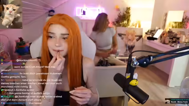 07:39:09Es wird über die Planung eines Halloween-Kostüms gesprochen, das auf Catherine aus Vampire Diaries basiert, da die Streamerin oft mit Nina Dobrev verglichen wird. Eine Perücke wäre dafür ideal gewesen, um die lockigen, braunen Haare nachzubilden. Es wird eine rote Perücke gezeigt, die für ein Vampir-Outfit gedacht war, das jedoch aufgrund einer Krankheit nicht getragen werden konnte. Das Kostüm sollte aus einem dunkelroten Vampir-Look mit schwarzen Jogginghosen und einem altmodischen Korsagen-Oberteil bestehen, ergänzt durch einen langen schwarzen Schleier und einen Mantel. Die Perücke ist weinrot und von guter Qualität, mit einem Netz vorne, das für einen natürlichen Look abgeschnitten und angeklebt werden müsste. Es wird auch erwähnt, dass man Perücken frisieren und mit Gel stylen kann. Eine weitere Perücke, eine orangefarbene, wird gezeigt, die für ein Hexenhaus-Outfit in Minecraft gedacht ist, inspiriert von Sabrina Spellman. Es wird über die Schwierigkeiten beim Stylen von Perücken gesprochen, wie das Erstellen eines Scheitels und das Ankleben von Babyhärchen. Es wird auch eine schwarze und eine blonde Perücke erwähnt, die für ein Mister-Mister-Cosplay von Death Note gedacht war. Die orangefarbene Perücke wird als Teil eines Hexen-Outfits mit einem schwarzen, spitzenähnlichen Outfit vorgestellt. Es wird betont, dass die Farbe des Oberteils einen großen Einfluss auf die Wirkung der roten Haare hat. Es wird scherzhaft erwähnt, dass man nicht jeden Rotton tragen kann, da es sonst wie eine Figur aus einer Kinderserie aussehen könnte.