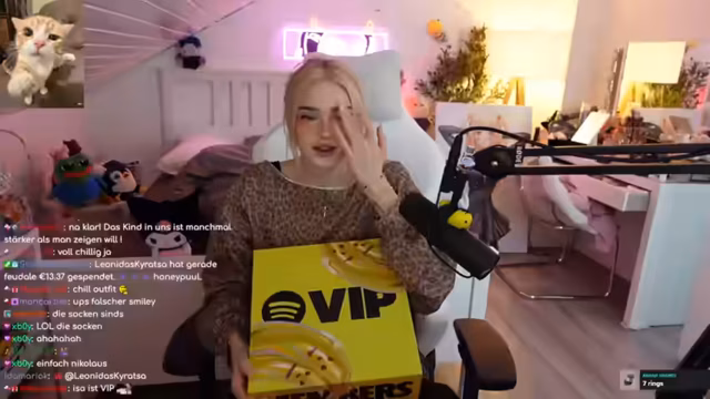 00:04:07Ein unerwartetes Paket sorgt für Aufregung, dessen Herkunft zunächst unklar ist. Es könnte von einem Zuschauer oder von Rockstar Games stammen. Nach der Öffnung stellt sich heraus, dass es sich um ein VIP-Paket von Spotify handelt. Dieses enthält exklusive Artikel wie Spotify-ähnliche Adiletten, einen kleinen Kaktus, eine Strandtasche und Kopfhörer, die die Streamerin für zukünftige Aktivitäten wie Basketballtraining oder einen Urlaub nutzt.