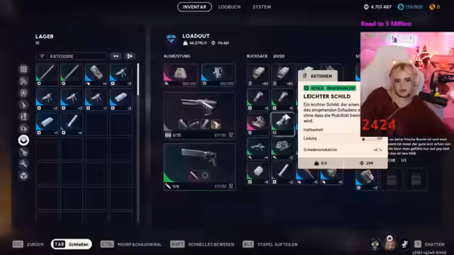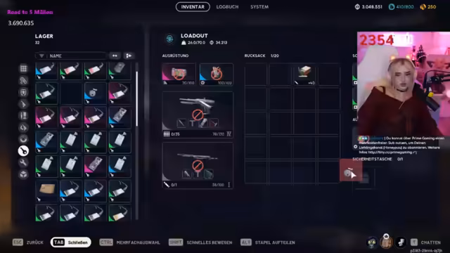 11:28:19Eine zentrale Entwicklung ist der stetige Aufbau der Ausrüstung. Der Spieler sammelt High-End-Waffen wie die Bobcat und die Tempest, die in den Kämpfen entscheidend werden. Es werden auch Gegenstände wie Wasserfilter und Munition gezielt gehandelt und gesammelt. Der Fortschritt wird verfolgt, da das Ziel von 5 Millionen Paketen immer näher rückt und der Kauf von wertvollen Items möglich wird.
