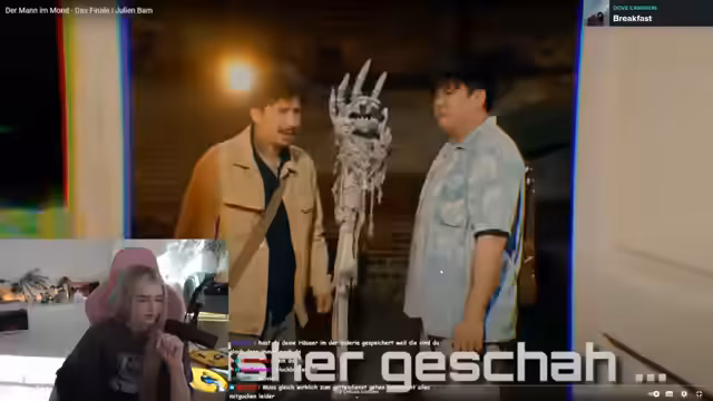 02:16:52Die Reaction beginnt mit dem Video 'Der Mann im Mond' von Julian Bam. Der Streamer verfolgt die Handlung des Films, die offenbar eine Serie mit verschiedenen Teilen ist. Während der Reaction macht er sich Notizen und kommentiert die Szenen. Er erwähnt auch Snacks, die er sich für die Viewer besorgt hat. Der Inhalt des Films scheint eine komplexe Geschichte mit verschiedenen Charakteren und Handlungselementen zu sein, die der Streamer detailliert beschreibt.