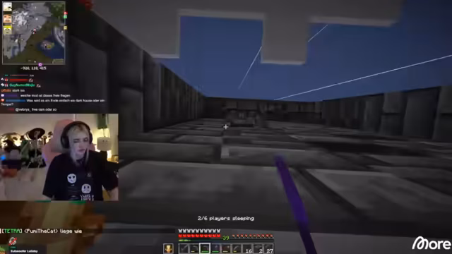 08:26:25Die Streamerin plant den Bau einer Farm in Minecraft und benötigt dafür Schienen und Eisen. Sie erwähnt, dass sie bereits zwei Eisenfarmen für andere gebaut hat, aber noch keine in ihrer eigenen Basis. Sie möchte diesmal auf Villager verzichten und ein modernes Gruft-Haus-Design umsetzen. Während des Baus experimentiert sie mit verschiedenen Materialien und Designs für Decken und Böden. Sie ist unzufrieden mit dem Fortschritt und den ästhetischen Entscheidungen, insbesondere mit der Platzierung eines 'Auges' im Design und der Wahl des Bodens. Sie fragt ihre Zuschauer und Mitspieler um Rat bezüglich der Gestaltung und überlegt, ob sie einen weißen Boden oder Terrakotta verwenden soll. Es wird auch ein Beacon erwähnt, dessen Funktionen sie noch nicht vollständig versteht und dessen Aktivierung sie herausfinden muss. Sie berichtet von Schwierigkeiten beim Abbau von Blöcken und der Notwendigkeit, ihren Beacon-Effekt zu aktivieren, um effizienter arbeiten zu können. Die Streamerin zeigt sich frustriert über die Komplexität des Bauens und die vielen Entscheidungen, die getroffen werden müssen.