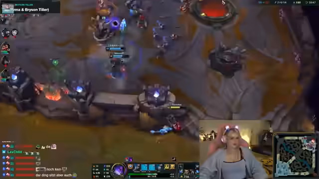 06:49:29Während des Streams werden die schönen Emotes des Chats gelobt. Es wird über den aktuellen Champion Akshan gesprochen, der im Gegnerteam gespielt wird. Die Streamerin zeigt Verständnis für die Nöte eines Spielers, der lange am Bildschirm sitzt, und empfiehlt Augentropfen. Ihre eigene Tilt-Situation wird thematisiert, da sie im Spiel gut performt, aber dennoch sichtlich frustriert wirkt, besonders weil sie mit dem Champion Aatrox nicht zurechtkommt und sich zu oft opfert.