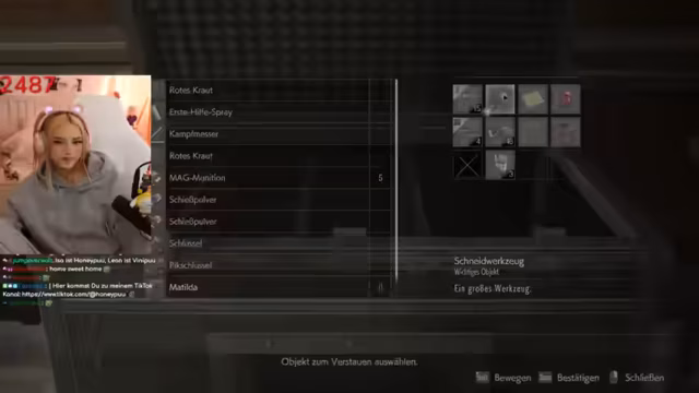 01:37:42Nach intensiven Kämpfen und dem Lösen eines weiteren Rätsels, das das Kombinieren von Gegenständen erfordert, erreicht die Streamerin den 'safe room'. Dort versammelt sie ihre gefundenen Gegenstände wie Heal-Täfelchen und Schießpulver. Sie atmet auf, nachdem sie eine Phase des Hochspannungs-Gameplays überstanden hat, und bereitet sich auf die nächste Aktion im Spiel vor. Die Stream gibt einen kurzen Überblick über ihre Ausrüstung, bevor sie in das nächste Kapitel vorstößt.