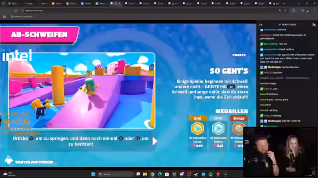 02:39:52Die Happy Hour beginnt um 19 Uhr und dauert eine Stunde. In dieser Zeit verdoppelt sich die Zeit für Abonnenten von 90 auf 180 Sekunden. Der Streamer berichtet von anstehenden Inhalten, wie dem Drehen am 'Content-Rad' nach dem Turnier. Währenddessen wird der Fokus wieder auf die Fortschritte der Spieler gelegt. Noah Z, der an der Wand scheitert, wird gefilmt und kommentiert. Sane gelingt jedoch ein guter Lauf, was für Jubel im Chat sorgt. Moderation und Interaktion mit der Community stehen im Vordergrund.