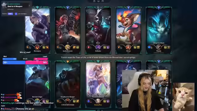 01:15:23Das Hauptgeschehen dreht sich um ein League of Legends-Spiel. Die Streamerin kommuniziert intensiv mit dem Chat, gibt Feedback über die Leistungen des eigenen Teams und beklagt sich über Fehlentscheidungen. Sie analysiert Spielzüge wie die fehlgeschlagene Invasion auf der Botlane und kritisiert das Teamplay, da sich jeder Spieler scheinbar solo stattdessen als Team agiert. Der Ton ist emotional und geprägt von Frust über die Niederlage.