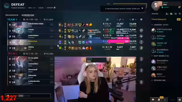 03:00:30Die Streamerin erwähnt, dass sie überlegt, Freddy nochmals wegen eines Coachings in Korea mit einem Lux-Main zu fragen. Freddy hatte angeboten, ihr dabei zu helfen, Kontakte zu knüpfen. Sie spricht positiv über ihre Freundschaft mit Freddy und wie glücklich sie ist, männliche Freunde zu haben. Während des Spiels bemerkt sie, dass ein Gegner aufgegeben hat. Sie reflektiert über ihr Spielverhalten und möchte ein bestimmtes "Fake-Part"-Verhalten ablegen, das sie von Danny übernommen hat. Sie findet es zwar witzig, wenn Danny es sagt oder sie es privat verwendet, möchte es aber im Stream reduzieren.