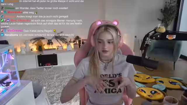 00:07:13Die Streamerin wechselt das Thema zu Beauty und persönlichen Idealen. Sie zeigt ihre Schmucksammlung, insbesondere mehrere Halsketten, und diskutiert, wie man diese optimal trägt. Dabei geht sie auf das Thema Körpermodifikationen ein, wie Augenringe oder Bauchdeckenstraffungen nach einer Geburt, und äußert ihre Ansicht, dass Eingriffe zur eigenen Zufriedenheit in Ordnung sind, solange kein sozialer Druck besteht. Sie warnt jedoch eindringlich vor gefahrvollen Beauty-Trends wie dem Spritzen von Hyaluron unter die Augen, da dies irreversible Schäden verursachen kann.