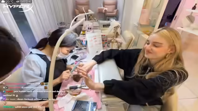 00:06:09Nach einer kurzen Verwirrung findet honypuu den Weg zum Nagelstudio. Sie erwähnt, dass die Mitarbeiter wissen, dass sie streamt und damit einverstanden sind. Sie describes ihre Reise zum Studio und zeigt eine Nudelbar in der Nähe. Sie lüftet ihre Frustration über ihren deutschen Schlafrhythmus, der es ihr schwer macht, sich an die lokale Zeit anzupassen.