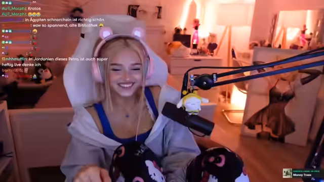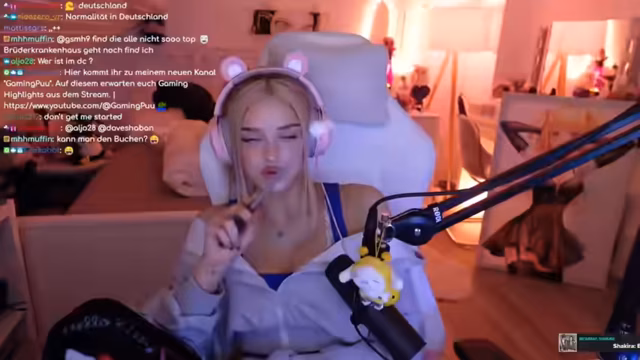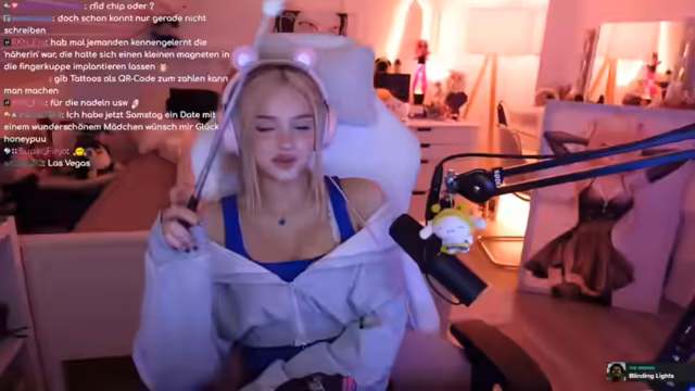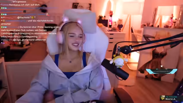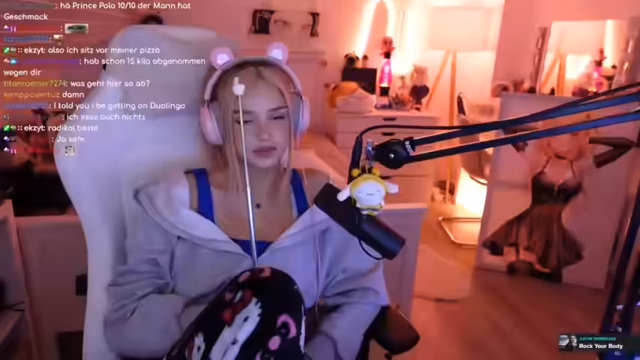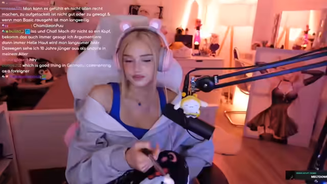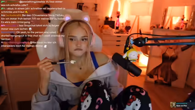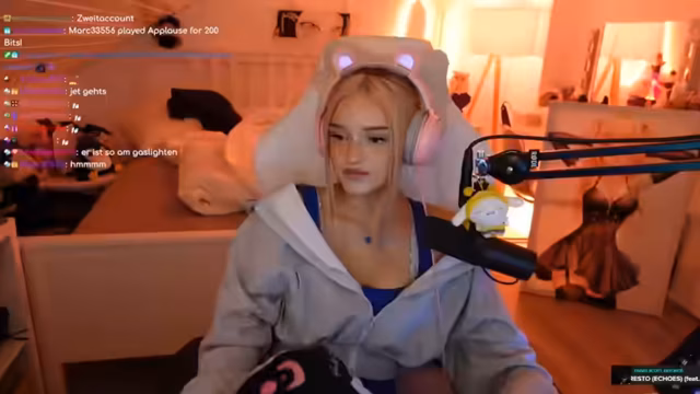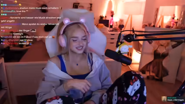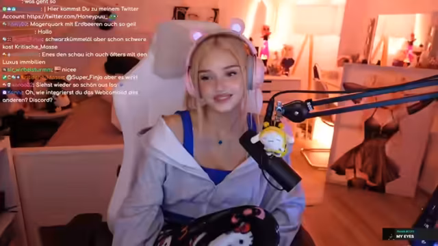 00:01:24Zu Beginn des Streams informiert die Streamerin über die Umstellung ihres Setup, da ihr PC zuvor überhitzt hatte. Nachdem die Kamera kurz ausgefallen war, berichtet sie über eine kleine Pflanze im Hintergrund, die auf Stream nicht mehr sichtbar ist. Die Streamerin erwähnt ihren Playlistnamen 'Honeypour' auf Spotify und Twitch und diskutiert kurz über Klebestreifen für Wimpern, die sie improvisativ anbringt. Dabei erwähnt sie auch, dass sie den PC auf eine Nachtkommode gestellt hat und sich über die Größe ihrer Hände lustig macht.