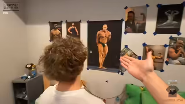 03:18:53Arthur zeigt sein persönliches Zimmer, das er mit seinem Freund Josh während eines zweiwöchigen Subathons namens 'The Biggest Loser' teilte. Bei dieser Herausforderung mussten sie herausfinden, wer am meisten Gewicht oder Körperfett verlieren würde. Eine 'Motivations-Gooner-Wand' mit Bildern von Streamern wie Knut, Mischief, Will Neff und NMPLOL diente als Ansporn. Arthur hat diese Wand selbst gebaut, was seine handwerklichen Fähigkeiten unterstreicht. Er erwähnt, dass er nach zwei Wochen aus diesem Zimmer geworfen wurde. Sein aktuelles Schlafzimmer ist etwas unordentlich, aber es beherbergt ein mobiles Setup mit drei Monitoren, die über USB-C angeschlossen werden können. Er bietet an, einen Affiliate-Link für dieses Setup zu teilen.