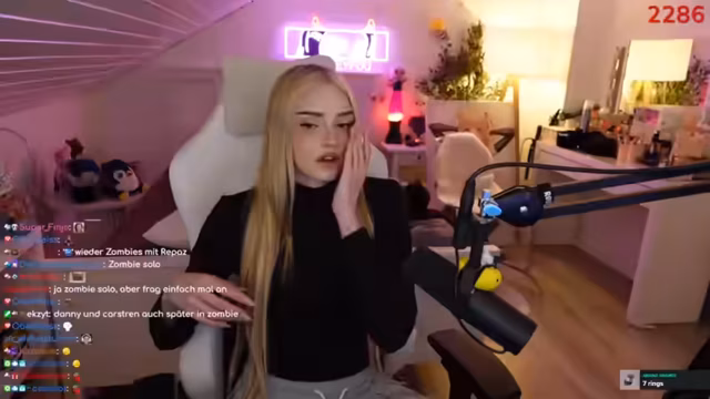 06:12:52Die Streamerin entscheidet sich, die Nacht durchzumachen, obwohl sie müde ist. Sie reflektiert, dass das Einschlafen und Wieder-Wachwerden nach nur wenigen Stunden Schlaf oft mehr Schmerzen und Bauchweh verursacht, als durchzumachen. Sie beklagt die Anwesenheit von 'Hobbylosen' im Chat, die sie auffordert, schlafen zu gehen. Sie äußert ihre Abneigung gegenüber bestimmten Spielern, die sich zu sehr mit ihren Kills brüsten. Es wird auch über die Möglichkeit gesprochen, das Handy mit dem PC zu verbinden, um Entwürfe zu zeigen, was sie auf Madeira eingerichtet hat. Sie bemerkt, dass sie ihre eigenen TikToks oft ansieht, weil sie diese mag, und vergleicht dies mit dem wiederholten Ansehen von Insta-Stories.