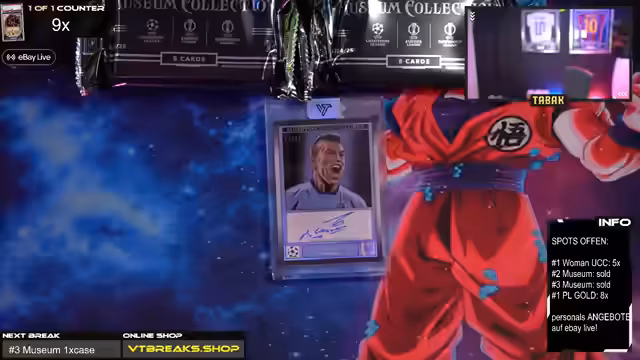 00:00:03Der Stream beginnt mit einer Begrüßung der Community und der Vorstellung des heutigen Programms. Die Themen umfassen Case Breaks von Topps-Sets wie Museum, Inception und Pixar, sowie Angebote von eBay Live. Es werden auch persönliche Spots und Live-Aktionen angekündigt, die von der Community gesteuert werden. Der Streamer kündigt zudem an, dass bis tief in die Nacht gestreamt wird und keine Eile besteht. Des Weiteren wird die Eröffnung des Museum-Shops erwähnt und eine Partnerschaft mit einem US-Shop für zukünftige Case-Breaks angekündigt.