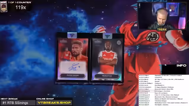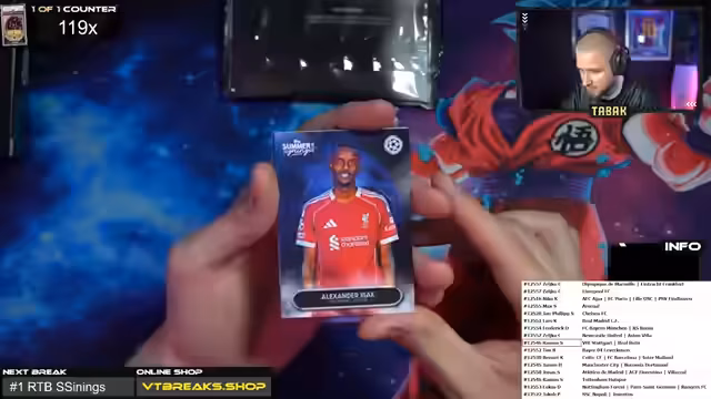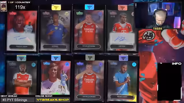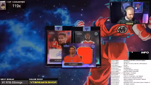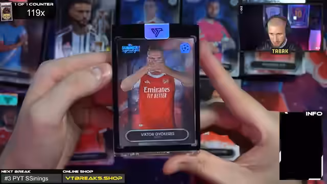 01:10:21Die Bundesliga wird als bereits entschieden betrachtet. Die One-of-One Karten werden als 'krank' beschrieben, mit beeindruckenden Patches. Luis Diaz zu /99 wird gezogen, sowie eine Autogrammkarte von Bayern und Rom. Dellup von Chelsea mit einer /50-Unterschrift ist die zweite oder dritte Chelsea-Autogrammkarte. Weitere Hits sind Elanga, Esugo und Giocares. Es fehlen noch Estebao und eine Image Variation. Hinckapie zu /50 von Arsenal wird gezogen, gefolgt von einem BVB Youngster. Es wird über die Seltenheit von Image Variations diskutiert, da bisher nur wenige gezogen wurden. Eine Jonathan Tah Karte zu /25 mit einem 'geilen Holo' wird für den Bayern-Spot gezogen. Der Streamer äußert Verwirrung über eine 'Redemption'-Karte im Set, da dies unerwartet ist. Die Redemption entpuppt sich als 'Tops Now Orange Autograph Parallel' von Viktor Gyökeres, limitiert auf /25, was als 'wild' und guter Start in den Break bewertet wird. Die Redemption ist 10 Jahre gültig.