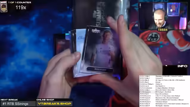 02:33:20Der Break beginnt mit der ersten Box, die einen Elanga zu 99 und einen Mikey Moore Rangers Autograph zu 299 enthält. Es wird auch ein Echeveri Leverkusen Rookie zu 50 gezogen, was als guter Hit betrachtet wird. Der Streamer wundert sich, warum bestimmte Spieler wie Jackson und Woltermann nicht im Set sind. Weitere Hits sind ein Rick Helme für Real Betis zu 99, ein Timothy Ware Autograph zu 305 für Olympic Marseille und ein Eze für Arsenal zu 4 von 10. Ein besonderer Fund ist ein Rookie Bayer Leverkusen Axel Tape Cobrissa mit einem Stück seines erstgetragenen Trikots. Es wird auch über die Seltenheit von Nick-Karten und die Möglichkeit, dass sie für zukünftige Bundesliga-Sets aufgespart werden, diskutiert. Der Streamer zieht Vergleiche zu Monte, betont aber, dass er keine Konkurrenz darstellt. Die Boxen performen gut, mit weiteren Hits wie einem Cherki zu 2 von 10 und einem Victor Gjörkeres Mech-Star. Es werden auch Paul Wanner zu 99 und Esugo zu 50 gezogen, sowie eine Image Variation von Gjörkeres, die als selten und schön beschrieben wird.