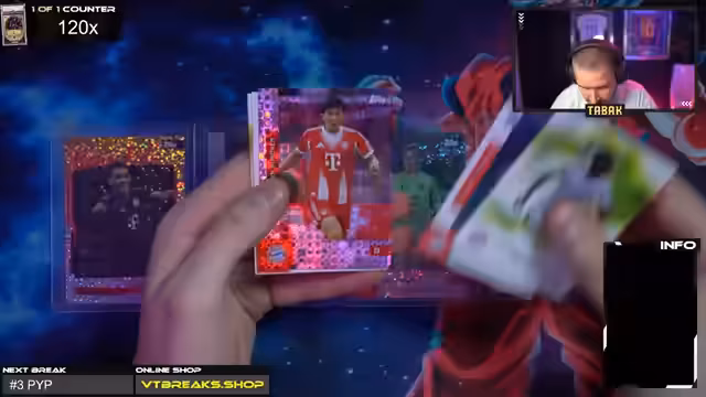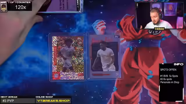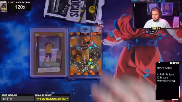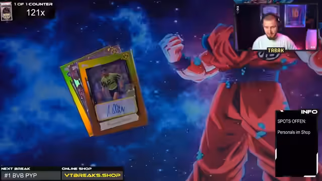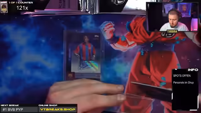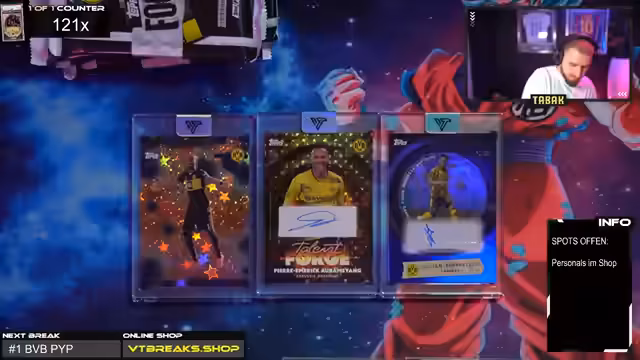02:50:50Im BVB-Case befinden sich 12 Boxen pro Case. Eine Diego Armando Maradona-Karte zu 99 wird gezogen und als Highlight gefeiert, auch wenn sie nicht für den Streamer selbst ist. Es wird nach der Anzahl der verbleibenden Spots für den Dortmund-Break gefragt, wobei noch neun von 25 Spots verfügbar sind. Der Streamer fordert die Zuschauer auf, die letzten Spots zu füllen. Ein Chris hat angekündigt, seinen Spot heute noch zu öffnen. Im weiteren Verlauf werden weitere nummerierte Karten gezogen, darunter eine Neymar zu 250. Die Diskussion über die Anzahl der Bayern-Spieler im Dynasty-Set wird angestoßen, da der Streamer selbst in Bayern-Spieler investiert hat.