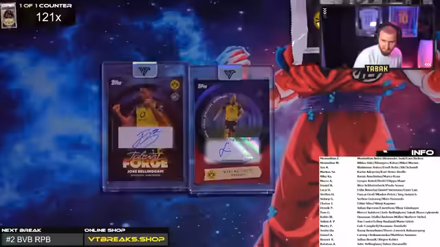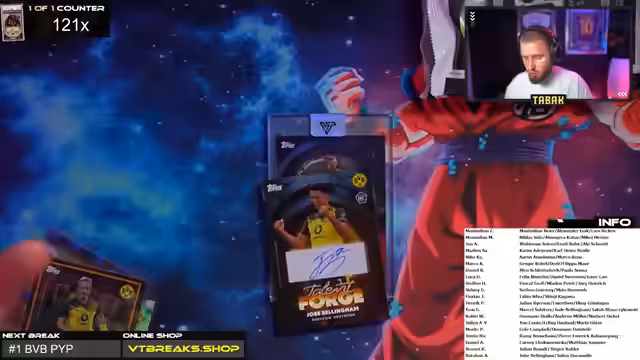 01:32:58Milan wählt die siebte Box für seinen BVB-Break. Es werden Karten wie Marcel Sabitzer, Aubameyang und Jude Bellingham gezogen. Ein Durinville Autograph zu 50 und ein Bellingham Rookie zu 75 sind Highlights. Marco wählt die vierte Box. Während des Breaks fällt die Flasche des Streamers auf das Mischpult, was kurz für Verwirrung sorgt. Es werden Waldemar Anton Auto zu 50 und Karim Ademi zu 25 gezogen, sowie ein Julian Brandt 10 von 10, der seine Jersey-Nummer trägt. Später wird ein Pierre-Emerick Aubameyang One-of-One Talent Forge Autogramm gezogen, was für große Begeisterung sorgt und als Top 3-5 Spieler der Checklist bewertet wird. Die Karte wird sofort für Instagram und TikTok festgehalten.