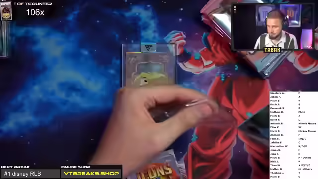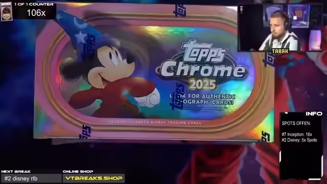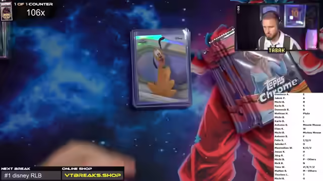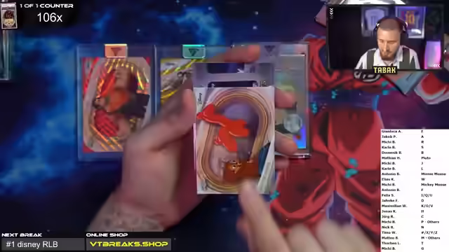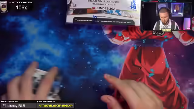 03:48:16Lothar Matthäus wird zu seinem 25. Geburtstag erwähnt. Michi hat sich den Eintracht Frankfurt Spot gesichert (#7) und damit Chan-User-Rookie ausgestochen. Es wurden bereits One-of-One Karten und einige coole Sachen gezogen. Im ersten Half-Case von Disney gab es bereits einige Hits, jedoch noch kein Booklet, Comic oder Autogramm. Es folgt ein zweites Random Letter Break, von dem man sich noch einiges verspricht. Die MLB-Karte müsste eigentlich auch noch kommen, da diese wohl einmal pro Case enthalten ist. Es werden Spots bei Disney vergeben, wobei sich der Streamer selbst drei Spots sichert. Die letzten neun Spots sind noch verfügbar.