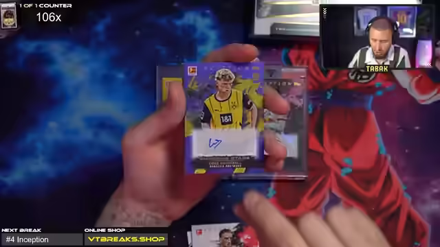 01:01:55In der vierten Box des Breaks wurde direkt eine One of One Karte entdeckt, was für Begeisterung sorgte. Es folgte der Fund einer Olaf Thun Schalke One of One Karte, was als großer Erfolg gefeiert wurde. Die Freude über den Schalke-Spot war groß, insbesondere für einen Supporter namens Kiri. Es wurde erwähnt, dass noch weitere Breaks online gehen werden. Es gab eine kurze Diskussion über ein neues iPhone und den Plan, eine Insta-Story zu machen. Drei Inception-Boxen für spätere Personals wurden erwähnt, und es wurde sich über die hohe Aufrufzahl des letzten Vlogs gefreut, der die Erwartungen übertraf. Es wurde ein Rabattcode für Collectible Protect Zubehör geteilt und darauf hingewiesen, dass dadurch kein direkter Gewinn erzielt wird, sondern es sich um einen Community-Rabatt handelt. Es wird erwähnt, dass noch 3-4 Spots mit CR7-Rabatt (20%) bei Premier League aktiv sind und bei Wegfall dieser Spots der nächste Breakdown ansteht.