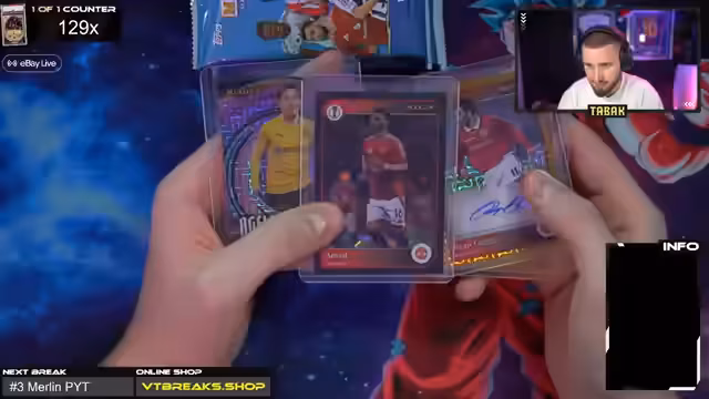 00:48:12Der Deko-Break beginnt mit der Öffnung mehrerer Boxen. Erste nennenswerte Hits sind ein Luis Figo 3/50 Pop-Up, ein John Collins Autograph sowie ein Schweinsteiger-Patch. Der Streamer erwähnt den Verkauf einer zuvor gezogenen Bukayo Saka-Karte für 20.000 Euro und zeigt sich zuversichtlich bezüglich weiterer Highlights im Verlauf des Streams.