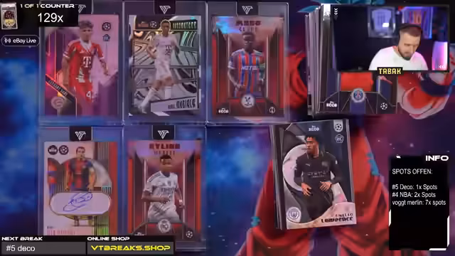 00:13:57Es werden die geplanten Break-Formate für den Stream vorgestellt: Deko-Break, NBA Hobby, Breaker Delight Merlin als Personal und weitere Specialty-Boxen. Der Streamer betont, dass die Deko-Boxen fast ausverkauft sind und ein reduzierter Spot für Inter Mailand angeboten wird. Zudem wird auf kommende Highlights wie den Full Case von Merlin Chrome hingewiesen.