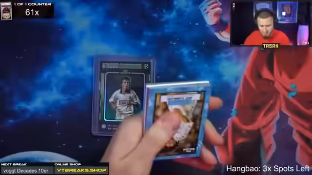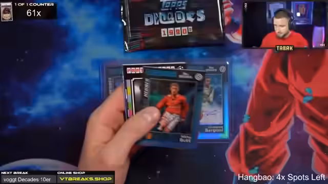 03:55:24Der Stream widmet sich der Eröffnung der teuren Hang-Bao-Box, die für 800 Euro gekauft wurde und nur acht Karten enthält. Zwei dieser Karten sind nummeriert, was ihren potenziellen Wert extrem hoch treiben kann, wenn z.B. eine seltene Messi-Autografenkarte dabei ist. Die Eröffnung der Box wird live im Stream gezeigt und danach per Zufall an die Teilnehmer der Breaks verteilt. Während der Verlosung werden verschiedene Karten wie Stefan Effenberg und Vieri gezogen und bewundert. Der Streamer erwähnt auch die Möglichkeit, einen Spot für einen neuen Decades-Break zu gewinnen.