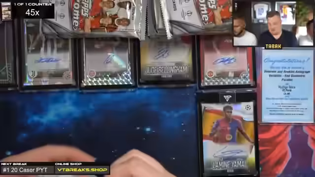 07:30:21Der Stream beginnt mit der Eröffnung von Boxen für einen Zuschauer, der eine seltene Messi-Ronaldo-Duel-Karte besitzt. Weitere wertvolle Karten wie die Lamin-Morientes-Karte werden erwähnt. Streamer diskutieren über verschiedene seltene Kartenarten, darunter Black Laser und Pro Case, wobei letztere als immer mit einer guten Black Laser ausgestattet gilt. Abgesehen von den technischen Aspekten der Kartenwertigkeit stehen die Zuschauerinteraktionen und die Freude über besondere Funde im Vordergrund.