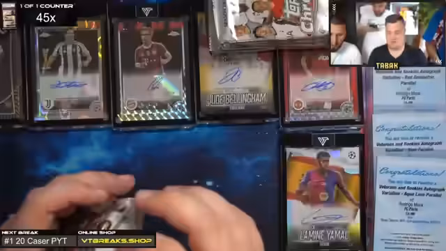 12:12:41Im weiteren Verlauf des Streams werden mehrere Black Laser Karten gezogen, darunter Golasu, Eto und Bergkamp Auto zu 75. Besondere Aufmerksamkeit gilt dem Lamin Rookie von Lamine Yamal, der als extrem wertvoll gilt. Die Teilnehmer diskutieren über den Marktwert solcher Karten und die Seltenheit von Inserts. Auch die Fetch- und Refractor-Karten finden Erwähnung, die als besonders begehrt gelten.
