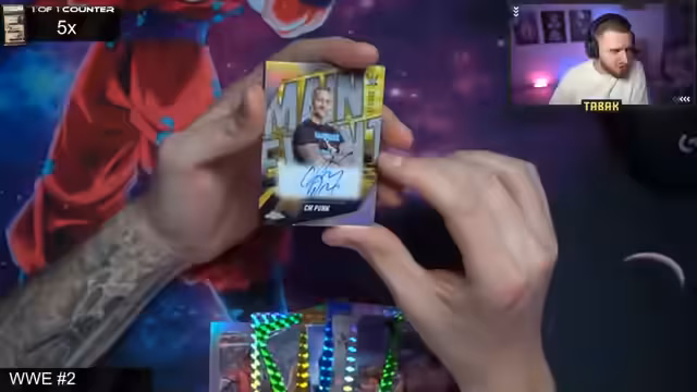03:13:18Der WWE-Break startet mit der Öffnung verschiedener Hobby-Boxen. Es werden mehrere Autogramme und On-Card-Signings von Superstars wie Kevin Owens, Ilja Dragunov und CM Punk gezogen. Der absolute Höhepunkt ist die Ziehung eines Undertaker Auto zu 25 für den Zuschauer Amir, was im Stream für eine immense Aufregung und Freude sorgt.
