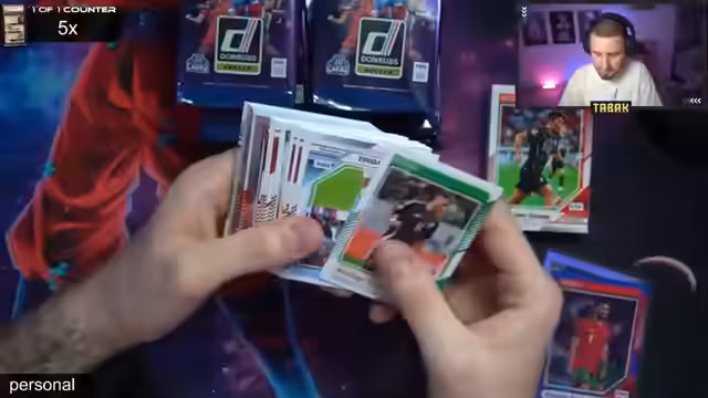 00:41:18Nachdem die WWE-Box erfolgreich eröffnet wurde, wendet sich der Streamer dem großen Donruss-Case zu. Der Case, der wie ein Buch aus 12 Boxen besteht und eine Masse von 360 Karten enthält, wird Pack für Pack geöffnet. Während anfang viele Basis- und Optik-Karten auftauchen, sind alle Augen auf das erste Kaboom-Pack gerichtet. Als dieses geöffnet wird, ist die Aufregung im Chat riesig. Es werden Stars wie Cristiano Ronaldo, Haaland und Erling Haaland gezogen, doch die große Frage ist, ob die legendäre Kaboom-Karte, die den Fall komplett machen würde, gefunden wird.