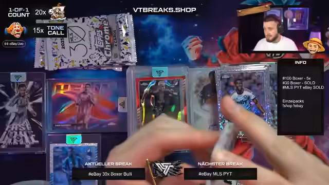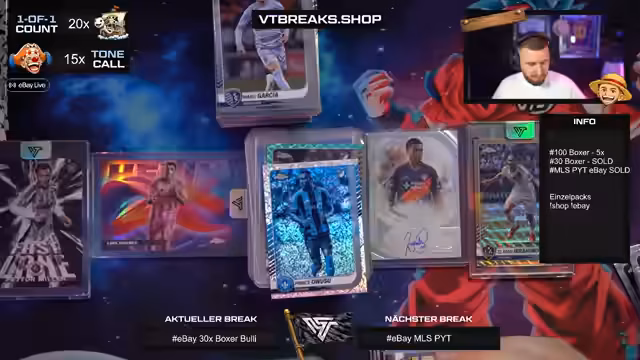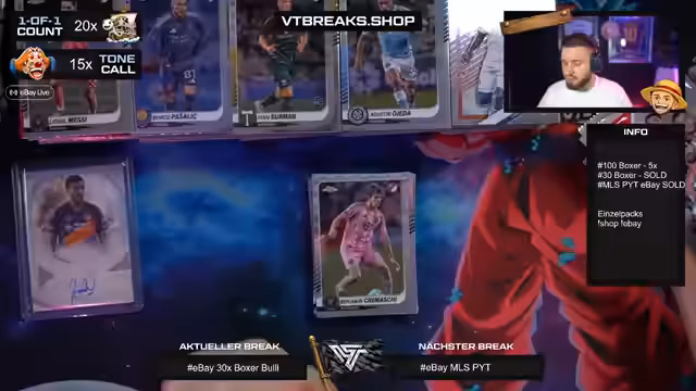 01:15:32Der Stream beginnt mit der Bestätigung, dass alle Artikel im EBay-Shop verkauft sind. Im Fokus stehen nun die Filler-Boxen, die im Shop und auf EBay erhältlich sind. Es wird der Inhalt der Filler-Boxen, darunter Karten von MLS und Breaks, gezeigt. Die Teilnehmer benennen ihre Spots, darunter Freiburg, Köln, Heidenheim und Leipzig, und der Streamer beginnt mit der Organisation der 30-Boxer-Boxen.