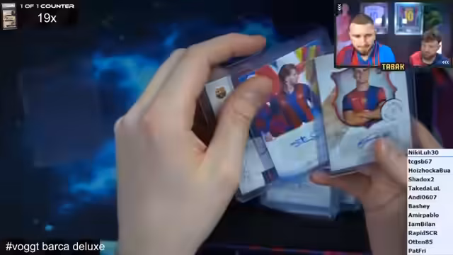 00:07:20Für die Zuschauer wird angekündigt, dass demnächst unterschriebene Karten jedem Paket im Shop beigefügt werden. Die Streamer haben zwei sehr teure 'Deluxe-Boxen' im Wert von jeweils 2.000 Euro im Programm. Es gibt weiterhin zwölf kleinere Barca-Side-Boxen, die geöffnet werden sollen. In jeder Box ist garantiert ein Autogramm enthalten. Zudem gibt es ein 'Pick Your Player' Format, bei dem die Käufer der Spots sich ihre Karten selbst aussuchen dürfen.