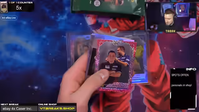 05:20:28Nachdem der Streamer sich um das Zubehör wie Sleeves und Toploader gekümmert hat, beginnt er mit der Öffnung des Darts Museum Cases für René. René gibt an, keine spezielle Chase-Karte zu haben. Direkt im zweiten Pack wird ein seltener Michael Smith Autograph gezogen. Des Weiteren finden sich Luke Littler zu 80 und Peter Wright Parallelkarten im Case. Auch ein Sketch von Loki aus dem Marvel Comic Book Heroes Set wird erwähnt, obwohl dieser für einen anderen Stream vorgesehen ist.